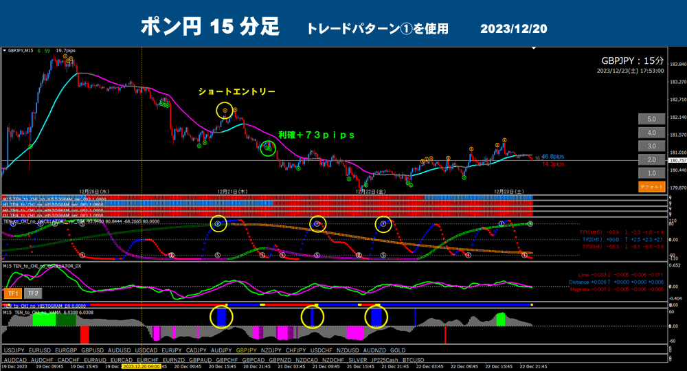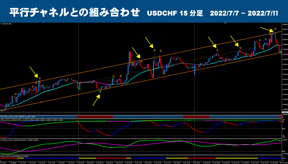 要するに、1つのチャートで複数のインジケーターを表示し、特定の条件の元、売買を判断して行くインジケーター。