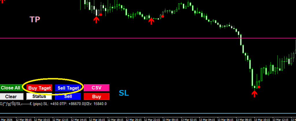 「Buy Taget」もしくは、「Sell Taget」ボタンをクリックすると、それぞれに適した「損切」と「指値」のラインを自動で描写が可能です。