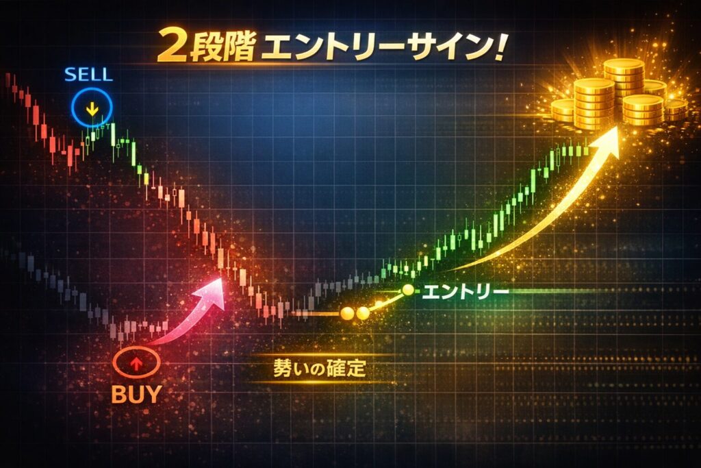 本インジケーターは、着実なブレイクに乗れるように、あえて「2段階方式」を採用しています。